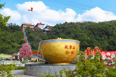 觀音山金碗滿溢金漆,光彩奪目,碗中有象征著“金銀”寶山,熠熠生輝,更有源源不斷流水滿碗而出,寓意著水滿財滿,財源不斷,捧個“金飯碗”,賺得盆滿缽滿。