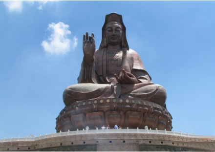 云海蓮臺(tái)地處西樵山風(fēng)景名勝區(qū)中心地帶,是以觀音文化為主題的大型景區(qū)。主要建筑有觀音法相、牌坊、影壁、放生池和浮雕等。觀音法相高達(dá)61.9米,是世界上最高的觀音造像。游客從北向入口,迎面聳立著一座六柱五門天柱牌坊,牌坊后隔著一個(gè)廣場,建有影壁,用優(yōu)質(zhì)花崗巖雕筑,左右各設(shè)山門,壁后刻有觀音六字真言,漢文由九華山住持、安徽省佛教協(xié)會(huì)會(huì)長仁德手書,藏文由西藏活佛親筆題寫。影壁上還刻有韋陀法像。影壁后為一放生池,池旁圍以蓮花作雕的白石欄桿,跨過放生池上的石拱橋,沿著283級(jí)開闊而整齊的石臺(tái)階,便可達(dá)觀音法像的蓮花座下。