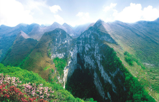 樂業(yè)天坑群:天坑群由方圓十多平方公里范圍的數(shù)個巨大的天坑狀溶洞組成。最大的天坑“大石圍”直徑500多米,深400多米,坑底有神奇的地下森林和地下河。其他的天坑,坑與坑之間有溶洞相連,非常罕見,所以被譽(yù)為“中華一絕”。