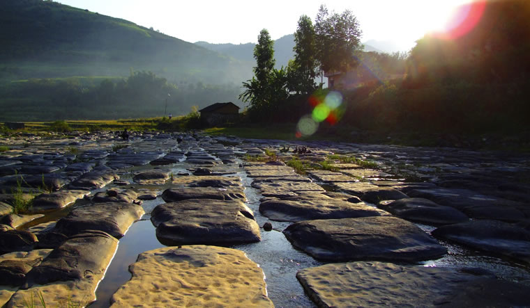 “神奇棋盤(pán)”坐落于田東縣最高峰——蓮花山下的靈岐河上,離那拔鎮(zhèn)政府僅3千米,距田東縣城40公里。專(zhuān)家認(rèn)為,水是縱向流動(dòng)的,但棋盤(pán)灘“水橫流”,這成了一個(gè)難解之謎。 棋盤(pán)灘面積約有30000多平方米,“棋盤(pán)”由一塊塊浮出水面的,大小為1平方米左右的石塊組成,每一塊石塊的四周都被深、寬都在30厘米,縱橫交錯(cuò),互相貫通的水溝圍繞,而且常年流水潺潺,人在“棋子”上可以任意走動(dòng),水不濕腳。