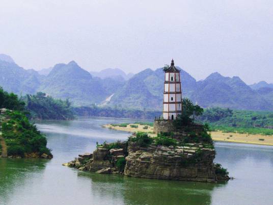 左江斜塔又名歸龍塔、水寶塔、歪塔,古稱鎮(zhèn)海寶塔,是世界八大斜塔之一,位于崇左縣城東北二千米處左江中的鱉頭山上。該塔建于明朝天啟元年(公元1621年),始建三層。清康熙三十五年(公元1696年)續(xù)建二層,為五層磚塔。塔底直徑5米,塔高18.28米,塔身呈八面體,塔頂置圓形鐵鍋一口。東西面砌磚數相差兩塊,故整座塔呈傾斜狀態(tài)。傾斜方向為西南偏西52°16′30″,傾斜度為4°24′64″,斜向與江水的流向正好相逆。