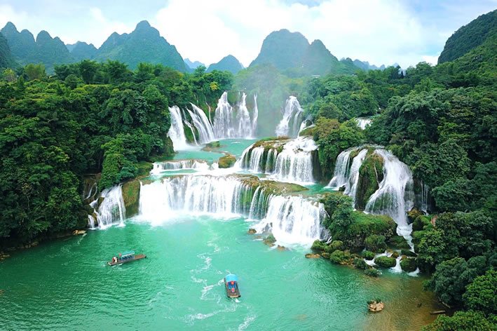 德天跨國(guó)瀑布位于祖國(guó)西南邊陲——廣西崇左市大新縣,開(kāi)門(mén)是越南,跨步進(jìn)東盟,是2015年11月中越兩國(guó)總書(shū)記見(jiàn)證簽約的中國(guó)首個(gè)跨境旅游合作區(qū)。距廣西首府南寧約196公里,距大新縣57公里,距紅色革命老區(qū)百色188公里,奇特的喀斯特地貌和自然山水風(fēng)光,被稱(chēng)為中越邊境的百里山水畫(huà)廊。景區(qū)占地面積約5.75平方公里,橫跨中越兩國(guó),形成中國(guó)的德天瀑布,越南的板約瀑布。因景觀獨(dú)特被譽(yù)為亞洲第一大跨國(guó)瀑布、中國(guó)最美的六大瀑布。 德天跨國(guó)瀑布于1992年對(duì)外開(kāi)放,2018年榮膺國(guó)家5A級(jí)旅游景區(qū),中越兩國(guó)以德天瀑布至碩龍鎮(zhèn)14.5公里的歸春河為天然國(guó)界,歸春河發(fā)源于廣西靖西縣鵝泉,全長(zhǎng)150公里,途經(jīng)越南,迂回35公里后又復(fù)入碩龍鎮(zhèn)德天村,“歸國(guó)遇春”便是當(dāng)?shù)卮迕褓x于它的美好寓意。歸春河經(jīng)大新縣德天村處被峙在江心的浦湯島所阻擋,使河水激石咆哮,奪路而下,遇斷崖跌落而形成高低落差不同的三級(jí)疊瀑。瀑布橫跨中、越兩國(guó),寬約200米,縱深60米,落差達(dá)70米,層層跌落,水勢(shì)激蕩,氣勢(shì)磅礴,是東南亞最大的天然瀑布,年均徑流量達(dá)每秒55.2立方米,約為貴州黃果樹(shù)瀑布的三倍,被稱(chēng)之為“天然氧吧”。
