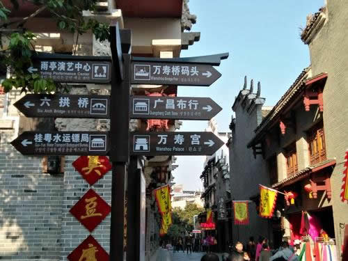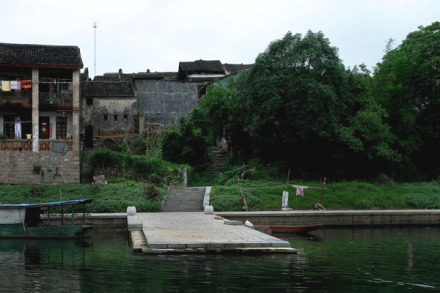 碼頭多用料石鑲砌,亦有因礁而設(shè)者。它們長(zhǎng)10余米,寬約3米,皆伸入江底,浮出水面,呈長(zhǎng)方形平臺(tái)狀。比起桂北一般圩鎮(zhèn)的碼頭來(lái),它們顯得穩(wěn)重,大氣;若與武漢的江岸碼頭,北海的深水碼頭相比,則顯得小巧玲瓏,古樸秀美。它們順江排列,而兩者之間卻并不等距,具有一種錯(cuò)落感,富有美學(xué)價(jià)值。碼頭靠岸的一端,多連有一段平地,或古榕濃蔭,或龍亭飛角,或丹桂飄香,或鳳竹搖曳,兼有實(shí)用和觀賞價(jià)值。碼頭與鎮(zhèn)區(qū)均有巷道相通,依坡砌級(jí),石板鋪路,高墻夾擁,逼深邃,天光一線,給碼頭平添一種縱深感和活力。