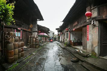 古鎮(zhèn)所有的房屋都是磚木結(jié)構(gòu),房門是一排木板,早晨把木板拿掉,家里的一切是透明的;到了晚上,再把木板裝上,就與外界隔絕了。這些房屋,每棟都有數(shù)百年的歷史。走在石板鋪成的街道上,房前有“咕嚕!蔽疅煹睦先艘约芭吭诶先四_邊打瞌睡的黃狗;肩上站著兩只魚鷹的漁夫穿著草鞋,從你身邊走過,去江邊捕魚;有相鄰的婦女在拉家常,時(shí)間仿佛在這里放慢行進(jìn)的腳步,生活顯得非常平靜,然而卻很溫馨。