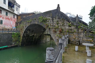 石板路旁的房子多為青磚、青瓦的兩層明清建筑,歷史滄桑隨處可見。每棟房子設(shè)計(jì)十分合理,集商住于一身,均由門前、天井、正房、廂房、后院組成?拷值囊话阕麂伱鎻氖律虡I(yè),有樓梯可上二層。往里走是天井,一般都栽有花草,利于采光;天井后是正房,高大寬敞,供著神像及祖宗牌位,是主人活動(dòng)、會(huì)客的地方;兩邊是用來(lái)居住的廂房。正房、廂房的門窗上都雕有花紋;正房后有門可到后院,后院臨江并建廚房和廁所,有石階可到江邊取水、洗衣。到大圩,萬(wàn)壽橋是必去的地方。萬(wàn)壽橋詩(shī)建于明代,是一座石塊砌起的石拱橋,橋面的石頭已被磨得溜光發(fā)亮,間雜些許小草,古樸自然。橋的西面是漓江,是欣賞漓江及對(duì)岸螺螄山的極佳位置。