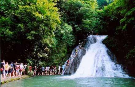 瀑布源頭比漓江水面高出180米,是我國(guó)唯一一個(gè)由地下涌泉形成的多級(jí)串連瀑布;是一個(gè)因鈣華沉積作用可逐漸長(zhǎng)高而改變景致的瀑布。八級(jí)瀑布形態(tài)各異,有的如鴛鴦戲水,有的如蛟龍噴水,有的懸于長(zhǎng)滿青苔的巖壁上,瀑水如布,水紋清晰可鑒,呈白色透明狀,猶如噴霧行云;有的水流集中下注跌入深潭濺起層層水霧浪花,猶如細(xì)雨蒙蒙,瀑布兩岸林木蔥郁,蔭蔽幽靜,水質(zhì)清洌,涼爽甘甜。山腳亞熱帶雨林濃郁,藤蔓垂壁,叢林險(xiǎn)徑,三千多畝的楓樹和馬尾松,風(fēng)吹林動(dòng),鳥語(yǔ)花香,令人有回歸自然的親切感。到了深秋時(shí)節(jié)的紅楓更是別一番“霜林盡染,漫山紅遍,紅葉鋪滿山徑”的美景。