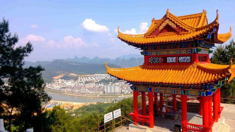 金子嶺位于漓江、荔江、茶江匯合處,與平樂(lè)縣城相對(duì)高度約600米。金子嶺觀景閣建筑風(fēng)格為南派大翹角多角式樓閣建筑,建設(shè)采用鋼筋混凝土現(xiàn)代建筑材料,仿明清時(shí)代大木結(jié)構(gòu)手法制作,主閣樓總高度44.83米,外觀結(jié)構(gòu)為五層,內(nèi)部結(jié)構(gòu)為九層,總建筑面積為2134.05平方米,其中底層建筑面積為813.43平方米。