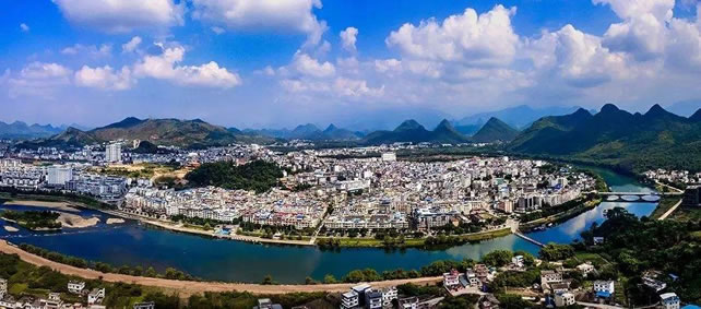 位置境域 恭城瑤族自治縣位于廣西壯族自治區(qū)東北部,桂林市東南部,東與富川瑤族自治縣及湖南江永縣交界,南與鐘山縣、平樂縣毗鄰,西接陽朔縣、靈川縣,北臨灌陽縣,縣城距桂林市108公里;全縣東西最長橫距56千米,南北最長縱距75千米,版圖總面積2139平方公里。