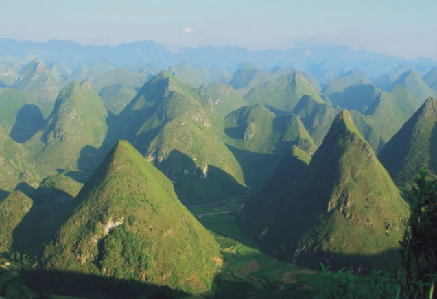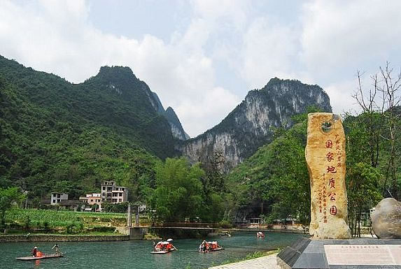 廣西樂業(yè)-鳳山世界地質(zhì)公園,位于廣西西北部云貴高原向廣西盆地過渡的斜坡地帶,由百色市樂業(yè)大石圍天坑群國家地質(zhì)公園和鳳山巖溶國家地質(zhì)公園組成,總面積930平方千米。現(xiàn)已發(fā)現(xiàn)大小天坑30個,是世界上最大的天坑群之一。地質(zhì)公園區(qū)中鳳山三門海景區(qū)擁有高穴馬王洞和水上天坑等地質(zhì)遺跡。天坑群中以大石圍天坑規(guī)模最大,深度和容積居世界第二;坑底森林面積10.5 萬平方米。
