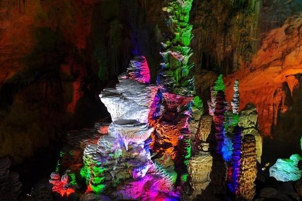 鴛鴦洞,位于縣城東面,鳳凰山腰,海拔700余米,為云貴高原南緣巖溶中高位雙層溶洞,洞中石柱、石筍、石幔琳瑯滿目。洞口高7.5m,寬12m。洞長480米,最寬處320米,巖廳最高點(diǎn)52米,面積為2.5萬平方米,洞內(nèi)大廳規(guī)模宏大。從洞口進(jìn)入便是第一層洞,游程迂回全長1200米,洞中乳石崢嶸,石筍高達(dá)36.4m,象擎天巨柱直插天空,20m以上高度的石筍約15個,6m左右高度的石筍更是不計其數(shù),在多處聚集形成了奇特的洞中石林景觀。洞內(nèi)最大的石幔高約15m,寬6m,顏色潔白,酷似瀑布。