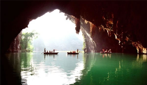 百鳥巖位于甲篆鄉(xiāng)烈屯西北面的漠齋山下,別名龍虎洞。因洞內(nèi)燕子棲集,蝙蝠掠飛,又名百鳥洞。盤陽河自吉屯白熊洞潛入山下,形成1000多米的伏流暗河后,在此洞流出。洞口寬50米,一石壁把洞口分成兩個略呈三角形的左右洞口。左側(cè)洞口寬40米,高15米,兩洞口內(nèi)側(cè)相通。洞深500米,蜿蜒曲折,直通與白熊洞一山之隔的拉類坳下的一個側(cè)洞口。洞中水平如鏡,深不可測,寬處約40米,窄處10米,從洞口行舟至300米轉(zhuǎn)折處,距水面30米處有一圓形天窗,山坳之光照到水面,猶如舞臺上的光束,色彩紛呈,近右側(cè)洞口處有沙灘,可?恐鄞I碁┯覀(cè)是一塊30多平方米的石臺,臺面深溝淺窩,坑坑坎坎,石臺一側(cè),洞壁雪白,可攀援其中。有石鷹、石柱、石幔、石觀音菩薩等,百態(tài)千姿,令人目不暇接。石臺的周圍有仙女梳妝、海螺石,石螺對面有石桌、石缸和石松果等。側(cè)面洞口外香椿林下野花艷目植被繁衍,把洞口點綴得幽靜雅致。洞中歧洞叉水道不可勝數(shù),密如蜂房,不知所向,整個洞仿佛一座裝飾華麗、景幻莫測的水下龍宮。其奇特的景象似桂林蘆笛巖,又因非乘舟不能游覽,游人贈予“水上蘆笛巖”的美譽。
