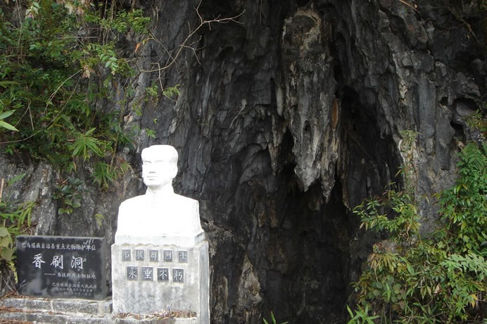 香刷洞位于西山鄉(xiāng)弄列村東北部的一座半山坡上,香刷洞為石灰?guī)r溶洞,洞口高5米,深10米,寬約6米,洞底型似臥底,洞中一年四季比較干燥,洞內(nèi)可容納20多人。洞內(nèi)右側(cè)一高處有一平臺,可以臥人,臺左側(cè)有一小洞穴可以匍伏出洞外。民國21年間(1932年)10月19日晚,堅持在右江斗爭的中國工農(nóng)紅軍獨立第三師師長韋拔群在戰(zhàn)略轉(zhuǎn)移中隱藏在此洞中,不幸被叛徒韋昂殺害,犧牲時僅38歲。香刷洞是巴馬瑤族自治縣縣級重點文物保護單位。