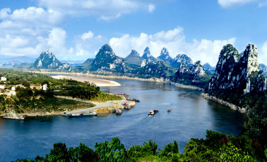五馬攔江,位于武宣縣城南郊,黔江南岸有5座弧列的山巒,活似5匹駿馬,將黔江截攔,強(qiáng)令黔江水繞東流,氣壯山河,江山輝映,景色迷人。在5匹駿馬之間,聳立一座竹筍狀的文筆峰,面對江中200余米長的橢圓形沙洲,俗稱:“古磧?yōu)?rdquo;,是武宣縣老八景之一—《古磧鐘聲》。昔日江水擊洲,聲如鐘鳴。