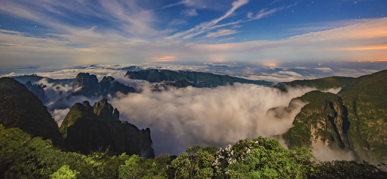 圣堂山景區(qū)位于金秀縣城南面,距金秀縣城38公里,距柳州市區(qū)134公里,距桂林市區(qū)210公里,距南寧市區(qū)329公里,距來賓市區(qū)224公里,景區(qū)面積約120平方公里,山體結(jié)構(gòu)架由7座海拔1600米以上巍峨奇異的群峰組成,主峰海拔1979米,為桂中第一高峰、廣西第五高峰。圣堂山山體龐大、崎嶇陡峭、怪石嶙峋,山上神奇秀麗的萬畝變色杜鵑林,變幻莫測的云海迷霧,奇松怪樹,古樸原始,自然生態(tài)優(yōu)良,物種豐富,森林覆蓋率達95.6%,具有雄、奇、險、秀、古、野等獨特景觀特色。 景區(qū)小氣候特征明顯,氣象瞬息萬變、幻化莫測,負氧離子含量最高達138000個每立方厘米,年均氣溫17℃左右,冬暖夏涼,是華南不可多得的避暑勝地和自然景觀,是最受瑤山人民推崇的“圣山”。景區(qū)先后獲評國家森林公園、國家級自然保護區(qū)、國家AAAA級旅游景區(qū)、中國森林旅游美景推廣地,自治區(qū)級生態(tài)旅游示范區(qū)自治區(qū)級森林康養(yǎng)基地等稱號。