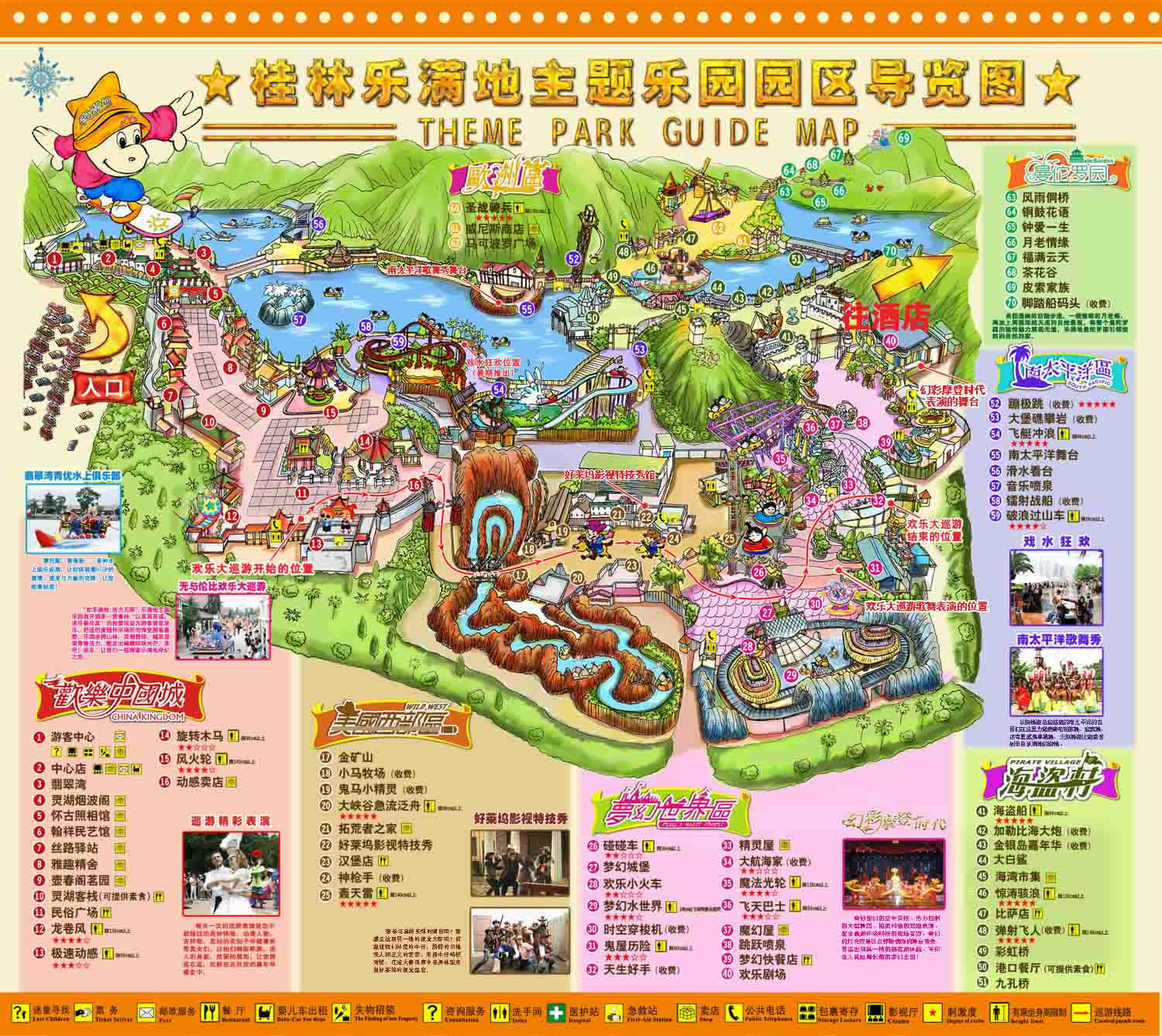 途中景點(diǎn):正門(mén) > 美國(guó)西部區(qū) > 夢(mèng)幻世界區(qū) > 海盜村 > 南太平洋區(qū) > 歐洲區(qū) > 曼陀羅園