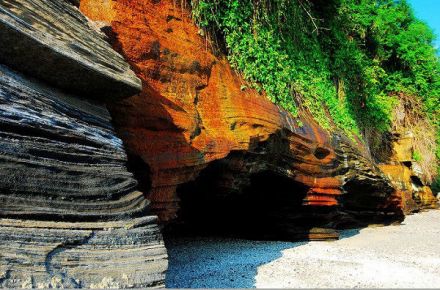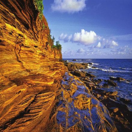 滴水丹屏原名滴水巖,位于潿洲島西部的滴水村,由巖石形成的懸崖峭壁是典型的海蝕地貌,裸露著的巖層,紅、黃、紫、綠、青五色相間,紋理十分清晰,崖頂之上藤樹纏繞,紅花綠葉倒掛崖頭,展現(xiàn)出旖旎多姿的色彩,故稱“丹屏”。巨崖巖層上長年涌動著水珠,不斷地向崖下滴落,所以取名“滴水”。滴水丹屏的形成堪稱是中國火山景觀的奇跡。
