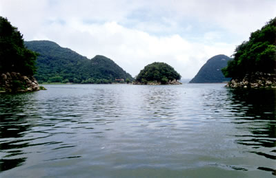 南湖的面積最大,景點(diǎn)也最多,南湖以洞多洞奇揚(yáng)名。首先映入眼簾的,是一組奇目的山巖壁石,這是小巧瓏?yán)识痔烊恍纬傻摹芭杈吧健薄_@里的石頭色彩特別豐富,青灰和棕黃的頁(yè)巖直插入碧水之中。大湖面逐漸狹窄,這兩邊的巖岸,如同斧劈劍削,有些游人把它呼為“小三峽”;這一片景觀石峰林立,如同到插的刀劍,給秀美的湖水增添幾許陽(yáng)剛之氣,人們把它稱(chēng)為“小石林”;這里的巖石,別有風(fēng)姿,它橫看不成嶺,側(cè)看不成峰,一片又一片向上堆積,有如卷幟浩繁的典籍,人們把它稱(chēng)為“峭壁天書(shū)”。
