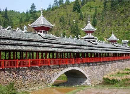 在侗鄉(xiāng)能和鼓樓媲美的,是侗寨的風(fēng)雨撟,俗稱(chēng)花撟。凡侗族人聚居地區(qū),有河必有撟,撟梁全都建筑在村前寨后的交通要道上。大部分為木撟,還有石拱撟石板撟竹筏撟等,寬四五米。青石作墩,杉木鋪撟面,上面是瓦頂長(zhǎng)廊。長(zhǎng)廊兩旁設(shè)欄桿長(zhǎng)凳,形如游廊,可供行人躲避風(fēng)雨,觀賞休憩。