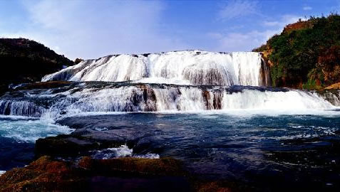 平水時(shí),白水河流量不大,水流清澈,瀑布水層沿著和緩的瀑面,均勻地撒開(kāi),如一層薄薄的、半透明的面紗,又如一面面張開(kāi)的素絹扇面,在陽(yáng)光下泛著銀光,故有人戲稱為“新娘面紗”。但當(dāng)洪季來(lái)臨,白水河中由于攜帶了大量山洪沖下來(lái)的泥沙而呈土黃色,陡坡塘瀑布便消失了往日平水時(shí)的秀色,而變得異常兇猛雄壯。