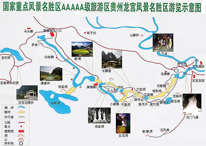 景區(qū)以溶洞、洞穴、瀑布為主體,堪稱(chēng)黔中一絕,包括龍宮、油菜湖、漩塘、螞蟥四大片區(qū)。龍宮中心區(qū)有臥龍湖、迎賓洞、龍門(mén)飛瀑、龍?zhí)短斐、龍宮暗湖、蚌殼巖、虎穴洞等景點(diǎn)組成,上下輝映,別有洞天,宛如神話中龍王所居的水晶宮殿。天池是一個(gè)山間湖泊,澄綠如玉,俗稱(chēng)龍?zhí),湖水下瀉,從巨大的溶洞跌拓而下,水墻壁立,寬25米,高約50米,驚濤奔涌,蔚為壯觀,此即龍門(mén),據(jù)稱(chēng)為中國(guó)地下瀑布之冠。這里有五段串珠式的暗洞、湖溶洞型地下河,五進(jìn)五出,稱(chēng)為五進(jìn)龍宮,全長(zhǎng)15公里,造型非常奇特,是中國(guó)發(fā)現(xiàn)的,最長(zhǎng)的水上巖溶。