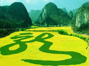 在龍宮漩塘景區(qū)通漩河左岸的田地里,春季采用的是油菜花和蠶豆套種,秋季采用普通水稻和黑糯米水稻套種,占地面積120畝,折合約8萬(wàn)余平方米的“龍”字景觀是從2009年2月下旬起,貴州(龍宮)第七屆油菜花旅游節(jié)期間開(kāi)始推出的。