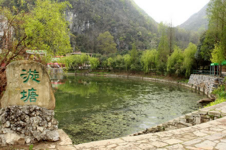 漩塘是國(guó)家級(jí)風(fēng)景名勝區(qū),在龍宮的上游。一個(gè)面積達(dá)萬(wàn)余平方米的圓塘,池水不借風(fēng)力,日日夜夜、年年歲歲永不停歇地沿著順時(shí)針?lè)较蛐D(zhuǎn)著。景象珍奇,令游客陶醉。通漩河的水流到這里便沉入地下,變?yōu)榈叵掳岛。塘面呈圓形,一年四季塘水以順時(shí)針?lè)较,挾帶水上綠色浮萍不停地漩轉(zhuǎn),終年不息。