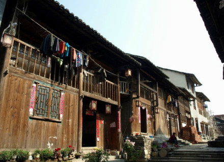 早期的民居建筑也大多還保留著漢文化的特點,以安徽、江西居多,其建筑形式、藝術(shù)手法均具明顯的徽派建筑特點。民居的基本單元一般為開間10米(三間開),進(jìn)深8米左右的兩到三層木構(gòu)建筑。建筑結(jié)構(gòu)采用穿斗式人字形坡頂,蓋小青瓦,外圍磚墻或泥石墻,頂部做成迭落形,端部做成馬頭狀,俗稱“馬頭墻”。屋檐出水向外挑出30厘米,采用“雙重脊檐”形式,青色的披檐鑲嵌在灰白色磚墻上。宅基均高出地面1米,房屋之間相對排列整齊有序,每家每戶前均有清一色的幾階青石臺基排列,大門上掛有標(biāo)志著屋主籍貫、身份的匾額,如“關(guān)西第”、“科甲第”、“洛陽第”等,且大門外墻呈“外八字”結(jié)構(gòu),其平面布置自外而內(nèi),先門第,再前屋,再正屋、后屋,每一屋均由天井相隔,天井以青石鋪就,低于臺基,天井內(nèi)放有青石制成的防火缸,缸上雕龍或飾有古代兵器戟,內(nèi)有暗溝以便排水,古鎮(zhèn)民居內(nèi)每戶必有一后門,且后門戶戶相通,目的是為了軍人家眷躲避戰(zhàn)火,戰(zhàn)事來臨時家家互相通告,由后門撤離至安全地帶。
