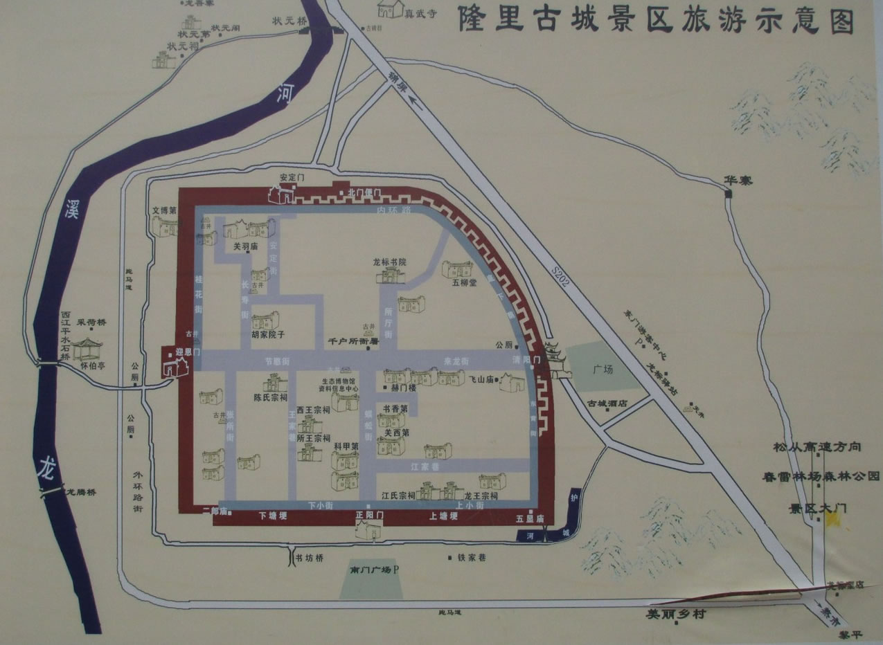 古城近似長方形,南北寬217米,東西長222米。城垣始建為泥土夯筑,天順元年(1457年)改以卵石框邊。周長1500米,城墻高一丈二尺,壕深一丈。 城周三里三分,東南西北各設(shè)炮臺一座。全城設(shè)東南西北四道城門,東門為清陽門,又名戌門,門上建有三層高戌樓。東門主要是作為官員、軍隊等進(jìn)城之門,取“紫氣東來”之意。南門為正陽門,西門稱迎恩門,除了門上建有兩層戌樓外,還設(shè)置了內(nèi)外兩道城門,即在門洞前筑有一堵圍墻,出門洞后需轉(zhuǎn)九十度彎再出一道門才能到達(dá)城外。這結(jié)構(gòu)被隆里人稱為“勒馬回頭”。古語中“北”、“敗”音相近意可互通,而“敗”字無疑犯了兵家之大忌,故北門常年閉門不開,且為取其藏風(fēng)聚氣之說,在北門上城樓上設(shè)有寺廟,供奉有菩薩,以祈求平安。城墻上設(shè)有跑馬道,城壁設(shè)有“天燈座”,用以傳遞訊息。古城墻外有護(hù)城河,以防敵人侵襲。