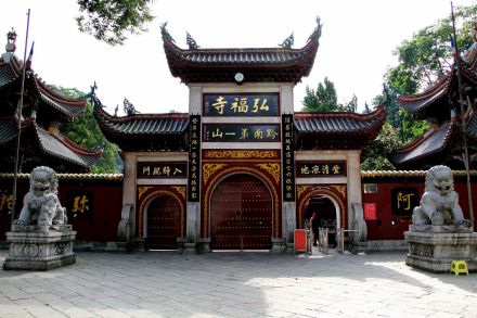 弘福寺為全國重點開放寺廟之一。清康熙十一年(1672年)由赤松和尚創(chuàng)建!昂敫!倍帜恕昂敕鸫笤,救人求世,福我眾生,善始善終”之意。沿九曲徑,經(jīng)二十四拐,可抵達弘福寺。弘福寺主要建筑有法化塔、九龍壁、大山門、鐘鼓樓、天王殿、觀音殿、大雄寶殿、玉佛殿、藏經(jīng)樓、說法堂、客堂、雙桂樓及方丈苑;有碑廊、素香齋、五觀堂和五百羅漢堂等大小建筑72座,加上放生池與茶樓等處,占地近11433平方米。徑旁摩崖石刻不絕,其中“虎”字高6米余,題名岱山趙德昌書,實為清著名書畫家孫清彥(竹雅)代筆。寺后象王嶺望城臺上(海拔1270米),建有“瞰筑亭”(1986年春劉海粟大師親書)。