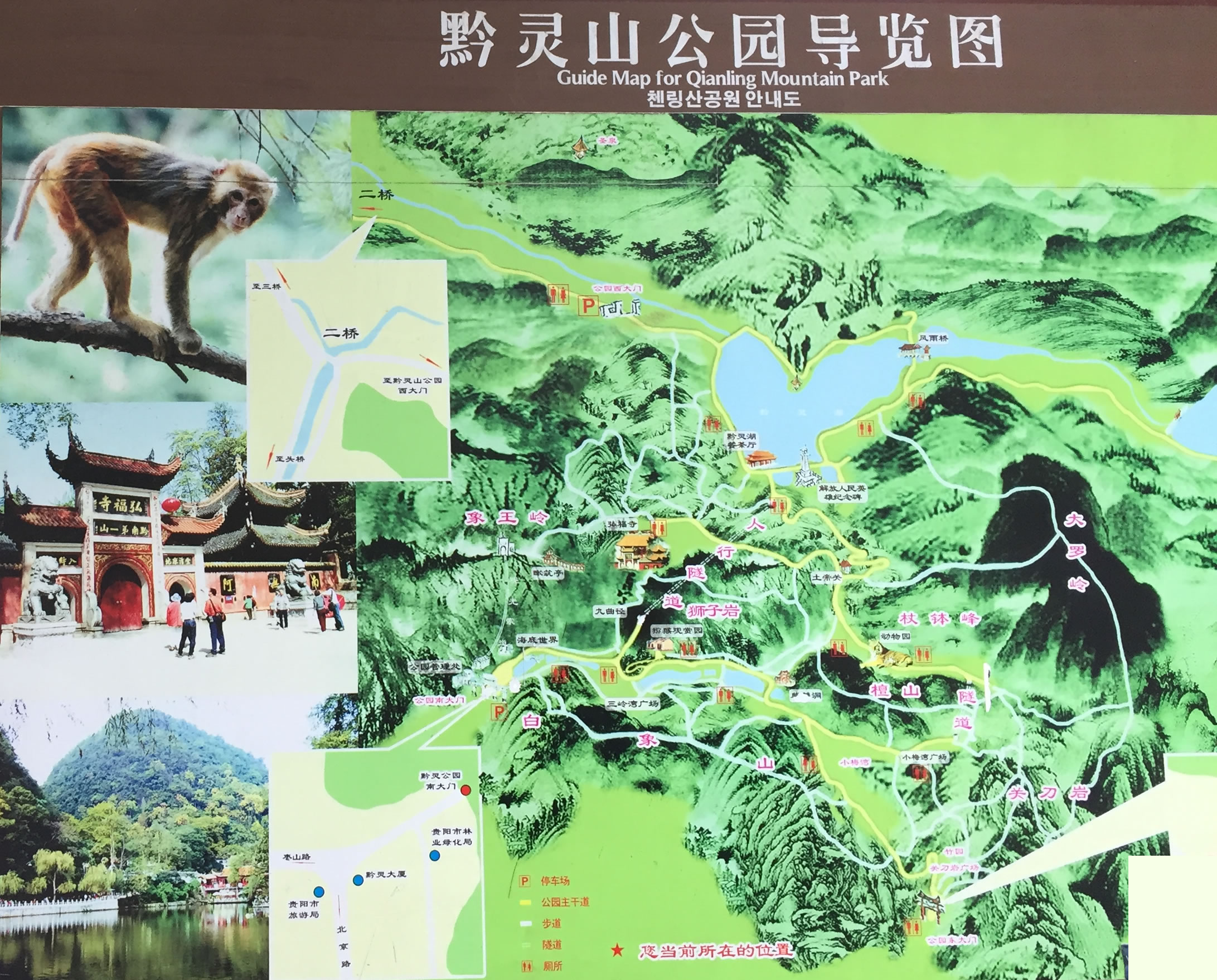 黔靈山公園是集自然風(fēng)光、文物古跡、民俗風(fēng)情和娛樂休閑為一體的綜合性公園,因素有"黔南第一山"之稱的黔靈山而得名。黔靈山由弘福寺、黔靈湖、三嶺灣等六個大的瀏覽區(qū)構(gòu)成,以山幽林密、湖水清澈為特色,集山、林、泉、湖、洞、寺、動物于一體,有“貴在城中,美在自然”之稱。黔靈山前有麒麟洞、古佛洞、洗缽池等古跡,山上生長著1500余種樹木花卉和1000多種藥材。