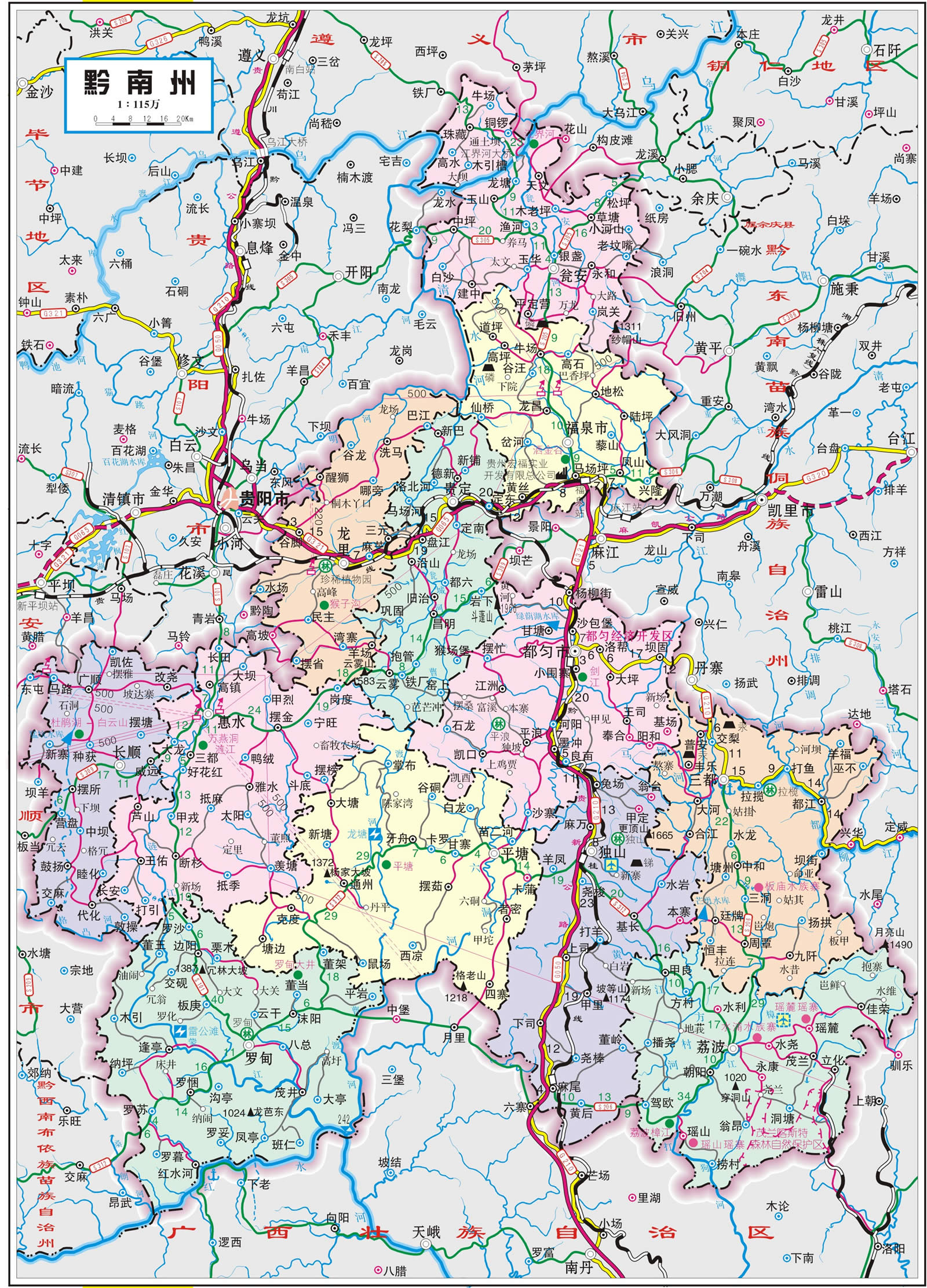 黔南布依族苗族自治州轄2個(gè)縣級(jí)市、9個(gè)縣、1個(gè)自治縣: