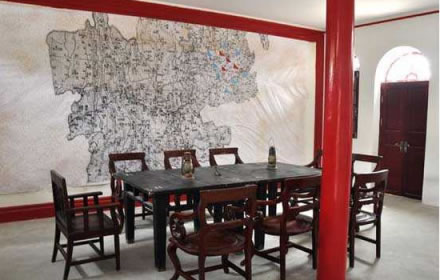 軍委總司令辦公室(作戰(zhàn)室)在遵義會議會議室正對的樓下,面積為56平方米,兩間長方形的房間組成,中間布一道可折疊的六合門。屋子正中陳列著兩張黑漆大方桌,桌上有鐵座馬煙、訂書機、中華蘇維埃共和國革命軍事委員會信 、報紙做的信封、30年代商務(wù)印書館出版的中國分省地圖冊以及《陳中日記》等。屋子的西窗下陳列著兩張三屈桌,桌上置西部皮包電話機,桌下立著線拐子。東窗下陳列著一對灰褐色的鐵皮公文挑箱。北壁上陳列著一幅巨大的云、貴、川三省接壤地區(qū)的軍用地圖,當年軍委副主席周恩來、紅軍總司令朱德、總參謀長劉伯承等經(jīng)常在這里辦公。