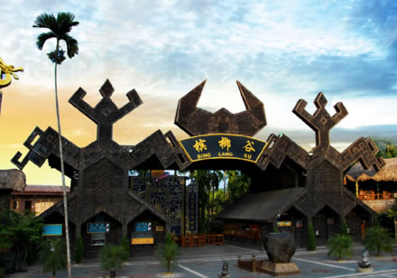 甘什嶺檳榔谷原生態(tài)黎苗文化旅游區(qū)自然景觀包括:黎族田園風(fēng)光、海南島面積最大、最古老的擯柳園、多種亞熱帶古樹、山泉溪水成多級瀑布從園中穿流而形成的怪石群。人文景觀有:“奧雅宮”(黎族頭人住的房);“隆閨屋”(黎族姑娘居住和娛樂的場所)等。來海南旅游觀光客可參與黎家古老的弓騖射擊,品嘗黎家竹筒飯和黎家山茶,觀賞多姿多彩的黎族歌舞。