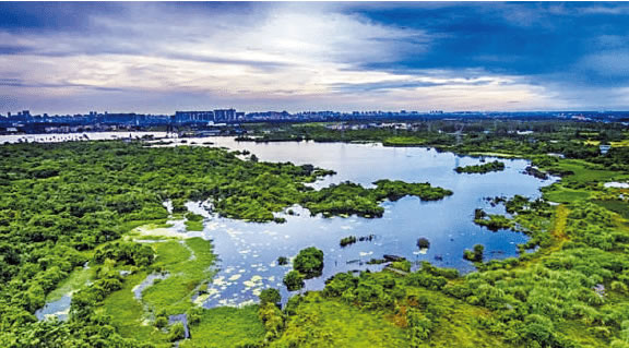 海口五源河國家濕地公園,南起永莊水庫,北至五源河河口海域,主要包括永莊水庫、五源河及河口海域3個濕地單元,規(guī)劃面積1300公頃(1.95萬畝),其中濕地面積958公頃(1.44萬畝),有4個濕地類及10個濕地型,濕地率為73.69%。公園內(nèi)共有野生維管束植物96科318屬427種,其中水蕨為國家二級保護(hù)植物。共有野生脊椎動物25目66科154種,其中國家Ⅱ級重點(diǎn)保護(hù)野生動物多達(dá)11種。五源河上游的永莊水庫及周邊大面積的火山熔巖濕地和灌叢沼澤區(qū),是?谑袇^(qū)內(nèi)自然生態(tài)保存較為完好的區(qū)域,擁有城市內(nèi)稀缺的動物棲息地和植被生態(tài)環(huán)境。