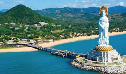 三亞南山海上觀音圣像敬造工程因其規(guī)模宏偉、意義殊勝、佛理底蘊豐富,被譽為“世界級、世紀級”的佛事工程。像體為正觀音的一體化三尊造型,寶相莊嚴,腳踏一百零八瓣蓮花寶座,蓮花座下為金剛臺,金剛臺內(nèi)是面積達15000平方米的圓通寶殿。金剛洲由長280米的普濟橋與陸岸相連,并與面積達60000平方米的觀音廣場及廣場兩側(cè)主題公園,共同組成占地面積近30萬平方米的“觀音凈苑”景區(qū)。