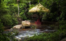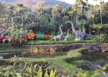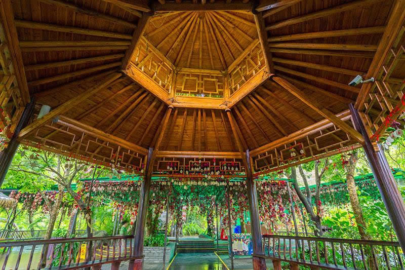 蘭花溪將中國(guó)傳統(tǒng)造園技巧與熱帶雨林文化進(jìn)行結(jié)合,附近有花草、茅草屋、徒步小道,長(zhǎng)藤下分布有樹桌椅。