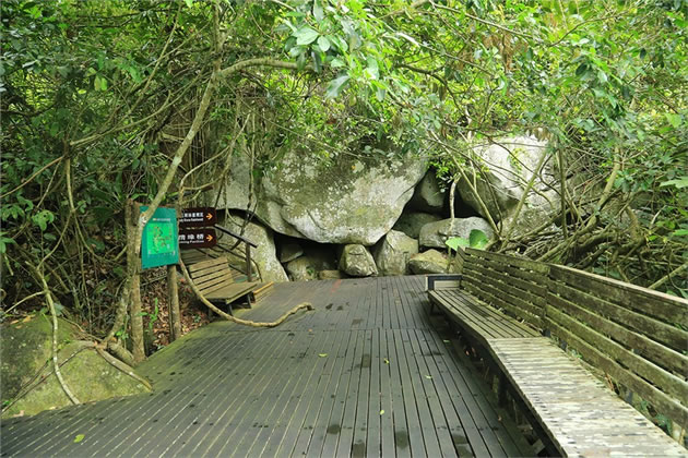 雨林谷的吉祥梯步向上走可見如同巨傘、渾身掛滿紅布條和小木牌的大榕樹,高約四十米,樹齡超過一千年,根系將中間的石頭團(tuán)團(tuán)抱住。樹下長(zhǎng)著眾多的莆葵和海芋,都被大榕樹伸出的枝條“攬”在懷中,當(dāng)?shù)厝朔Q其為“峒主神樹”。