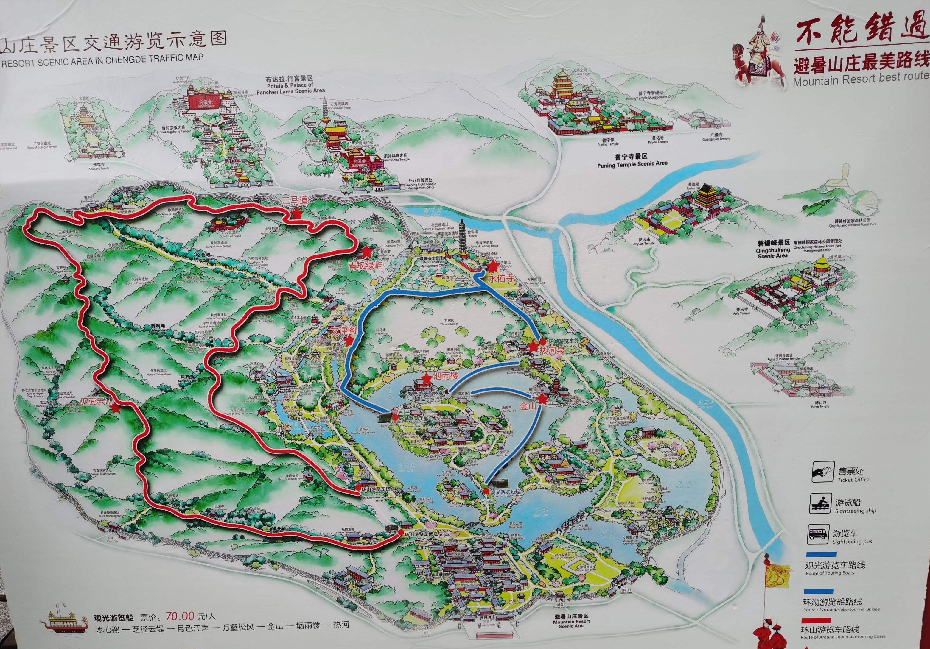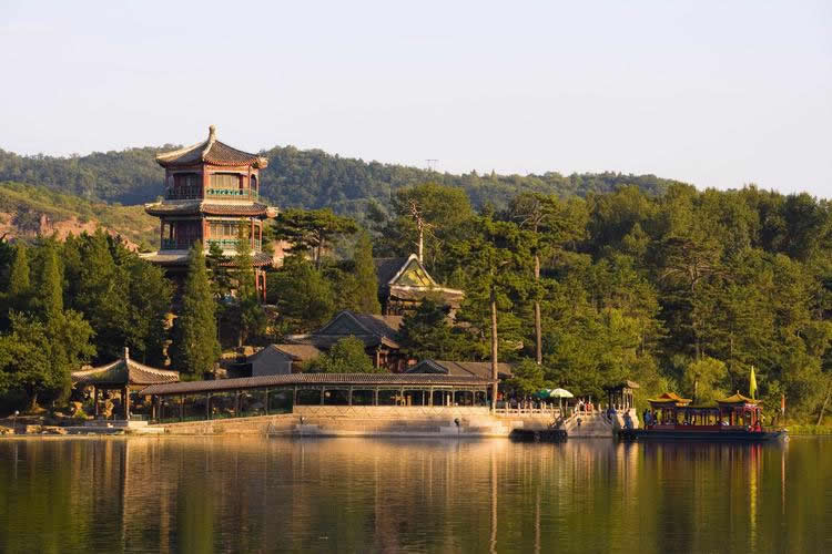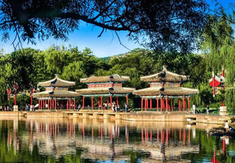 山巒區(qū):位于山莊西北部,面積443.5萬平方米。山區(qū)占了整個園林面積的五分之四。從西北部高峰到東南部湖沼、平原地帶,相對高差180米,形成了群峰環(huán)繞、色壑縱橫的景,山谷中清泉涌流,密林幽深。高聳的山峰好似天然屏障,阻擋了西北寒風的侵襲,是調(diào)節(jié)山莊氣候的重要因素。當年利用山峰、山崖、山麓、山澗等地形,修建了多處園林、寺廟,共計40余處。