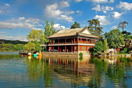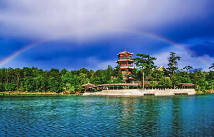 湖泊區(qū):苑景區(qū)的精華基本上在湖泊區(qū),康熙曾夸耀說,“天然風景勝西湖”。由于洲島錯落,湖面被長堤和洲島分割成5個湖,各湖之間又有橋相通,兩岸綠樹成蔭,山莊主要的風景建筑又都散落在湖區(qū)的周圍,因此顯得曲折有致,秀麗多姿。湖泊區(qū)位于山莊東南,面積49.6萬平方米。有大小湖泊八處,即西湖、澄湖、如意泅、上湖、下湖、銀湖、鏡湖及半月湖,統(tǒng)稱為塞湖。 湖區(qū)的風景建筑大多是仿照江南的名勝建造的,如“煙雨樓”,是模仿浙江嘉興南湖煙雨樓的形狀修的。金山島的布局仿自江蘇鎮(zhèn)江金山。湖中的兩個島分別有兩組建筑,一組叫“如意洲”,一組叫“月色江聲”。“如意洲”上有假山、涼亭、殿堂、廟宇、水池等建筑,布局巧妙,是風景區(qū)的中心!霸律暋笔怯梢蛔碌乃暮显汉蛶鬃、堂組成。每當月上東山的夜晚,蛟潔的月光,映照著平靜的湖水,山莊內(nèi)萬籟俱寂,只有湖水在輕拍堤岸,發(fā)出悅耳的聲音,“月色江聲”的題名便是由此而來。湖泊區(qū)集南方園林之秀和北方園林之雄,將江南園林的景觀移植到塞外。區(qū)內(nèi)湖泊總稱“塞湖”,總面積57公頃。