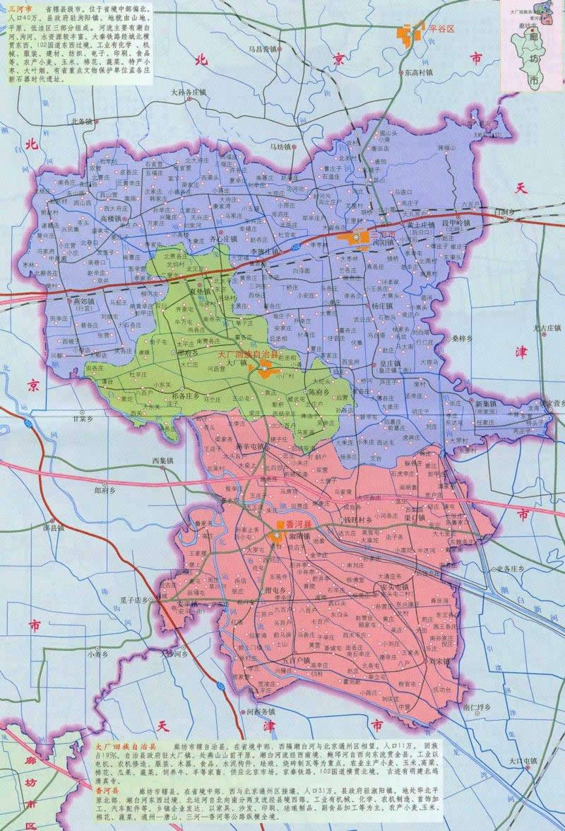 1993年經(jīng)國(guó)務(wù)院批準(zhǔn)撤縣設(shè)市,現(xiàn)轄10鎮(zhèn)2區(qū)(燕郊省級(jí)經(jīng)濟(jì)技術(shù)開(kāi)發(fā)區(qū)、省級(jí)農(nóng)業(yè)高新技術(shù)園區(qū))、2個(gè)街道辦事處、395個(gè)村街。