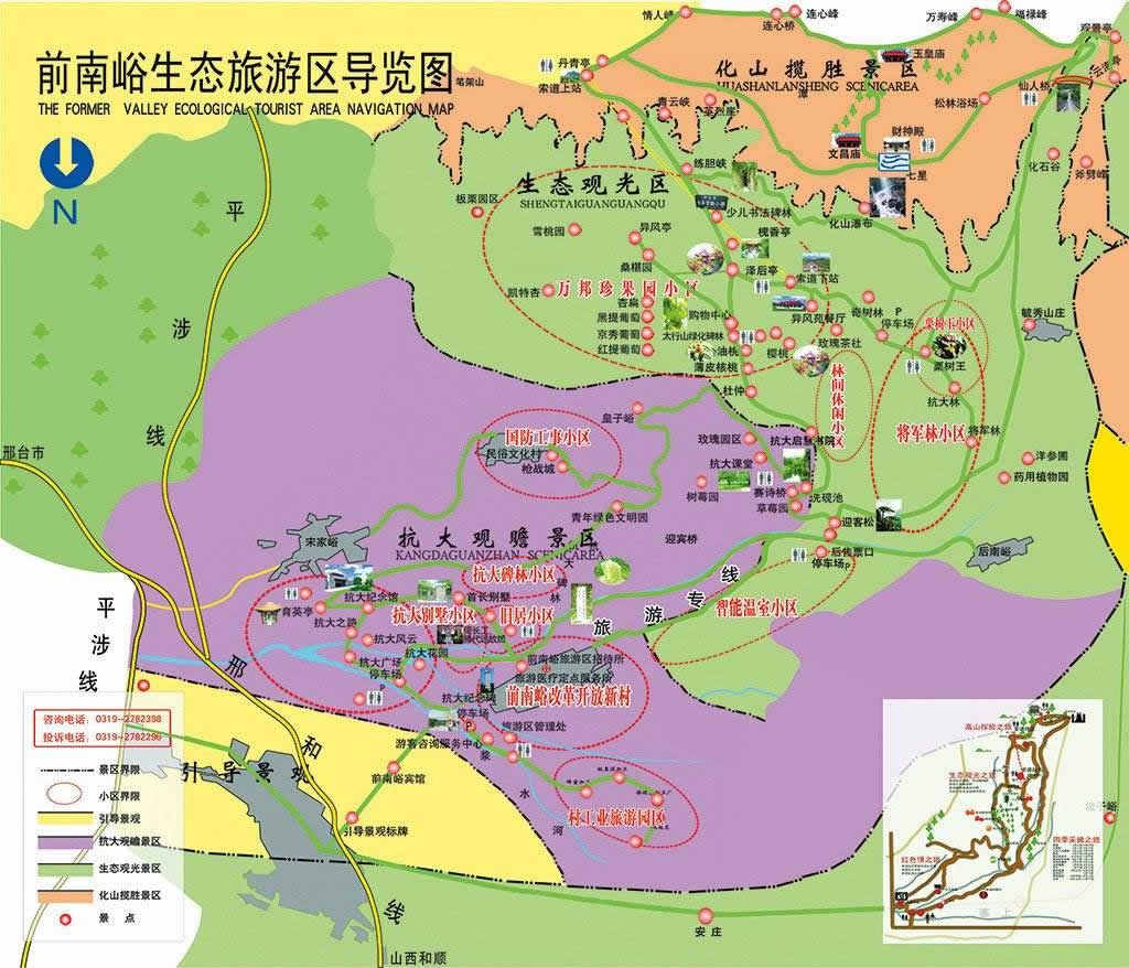 前南峪國家森林公園里有全國愛國主義教育示范基地——抗大陳列館、紀念碑和大型浮雕像;筆架山、練膽峽、斧劈峰、七星閣、文昌閣、澤后亭等景點;萬邦珍果內(nèi)已有美國紅提葡萄、澳洲秋紅油桃和烏克蘭櫻桃等品種;萬株唐代板栗樹和西洋參、杜仲、丹參、金銀花等數(shù)十種保健藥用植物;還有14億年前的植物化石、古長城、志高厴、溫泉寺等古跡。