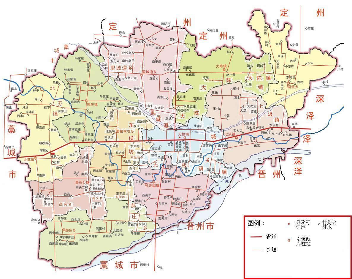 鎮(zhèn):無極鎮(zhèn)、七汲鎮(zhèn)、張段固鎮(zhèn)、北蘇鎮(zhèn)、郭莊鎮(zhèn)、大陳鎮(zhèn)