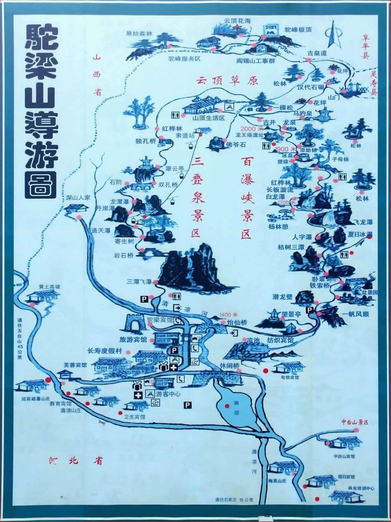 駝梁自然風(fēng)景區(qū)位于河北省平山縣西北部,東距省會(huì)石家莊市150公里,西距佛教圣地五臺(tái)山45公里,北起駝頂,南至四道溝(又稱(chēng)南溝),長(zhǎng)5公里;東自峰脊,西至山西省界,寬約4公里,總面積為22平方公里,主峰海拔2281米,是平山、阜平、山西五臺(tái)三縣的分水嶺,為河北省五大高峰之一,在當(dāng)?shù)乇环Q(chēng)為“小泰山”,素有“省會(huì)屋脊”之稱(chēng)。駝梁之名,是因山頂兩峰此起彼伏,形如駱駝峰脊而得。山體屬典型的變質(zhì)巖地貌結(jié)構(gòu)。以奇、秀、高、遠(yuǎn)聳立于巍巍太行,更以涼、幽、靜、野而馳名華北,久享“太行綠寶石”美譽(yù)。由四道溝入山,沿碎石路蜿蜒而上,兩側(cè)青山聳立,怪石磷峋,松生崖,虬藤攀緩,路邊流水撫石,樹(shù)間小鳥(niǎo)鳴唱,好一派風(fēng)光。