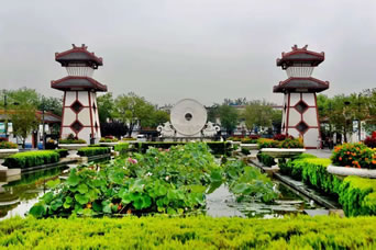 即趙苑的北大門,為一組仿秦漢風(fēng)格的建筑,兩側(cè)是門闕。中間雕塑造型為當(dāng)時(shí)名揚(yáng)列國的趙國名寶“和氏璧”。據(jù)史書記載,此玉放在暗處自然有光,不沾灰塵,能避邪,放在身邊,冬暖夏涼,百步之內(nèi),蚊蠅不人,有諸多神異之處,難怪秦王愿以十五座城池來換它,可想它的神奇和價(jià)值。和氏璧上面的八個(gè)篆字“受命于天,既壽永昌”。相傳是秦朝丞相李斯所書。整個(gè)大門莊重典雅,氣勢(shì)恢宏。