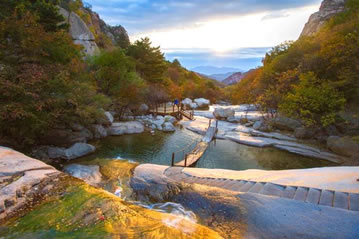 夏季,風涼氣爽,云蒸霞蔚。登臨主峰,可觀云海,看日出,瞧佛光,俯群山。云海、云流、云瀑是祖山夏季的特有景觀。因祖山海拔較高,又瀕臨渤海,此時登臨任何峰頂,可觀到滔滔的云海,觸摸到擦肩而過的朵朵白云,她們一會兒行云流水,環(huán)山而淌;一會兒宛如融雪的春潮,裊裊地升入蔚藍的天空;一會兒像脫結的野馬,入海的姣龍,奔騰咆哮,排山倒海。當你倘佯在“北龍?zhí)丁、“花果山”景區(qū)時俯看谷中,涓涓細流,清澈見底;仰望山間,瀑布飛掛,奔騰咆哮,大有“飛流直下三千尺,疑是銀河落九天”之氣魄沿溝谷而下,那真是水繞青山,山繞水,山浮綠水,水浮山。