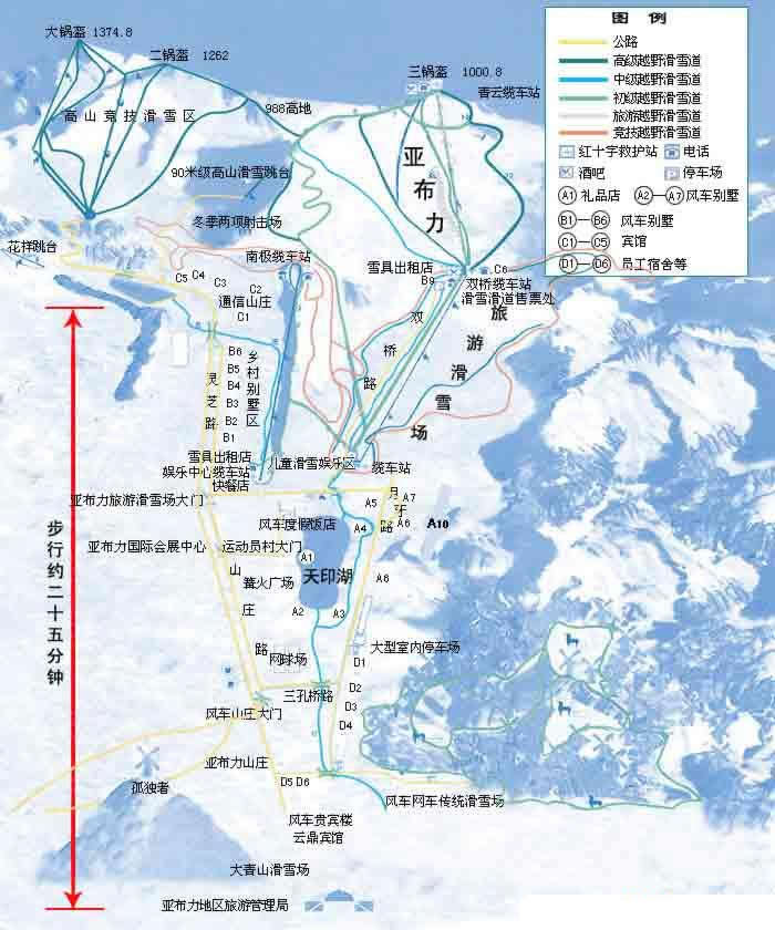 亞布力滑雪旅游度假區(qū)由具有國際標(biāo)準(zhǔn)的高山競技滑雪區(qū)和旅游滑雪區(qū)兩大部分組成,占地面積22.55平方公里。在大鍋盔(海拔1374米)、二鍋盔(海拔1262米)和二鍋盔與三鍋盔之間的海拔988米高地處修建了具有國際標(biāo)準(zhǔn)的高山競技滑雪場,有9條高山滑雪道,7條越野滑雪道,6條滑雪纜車和花樣跳臺(tái),90米級(jí)高山跳臺(tái),冬季兩項(xiàng)靶場及室內(nèi)體育館、運(yùn)動(dòng)員村等場地。在三鍋盔(海拔1000.8米)建成了大型旅游滑雪場,擁有l(wèi)l條高、中、初級(jí)滑雪道,總長度30公里,其中有長5公里的5號(hào)雪道,l條5公里長的環(huán)形越野滑道,2公里長的全墊升氣墊船、雪地草地摩托及雪橇專用道,3條雙人吊椅式旅游纜車索道和3條拖牽式旅游索道。