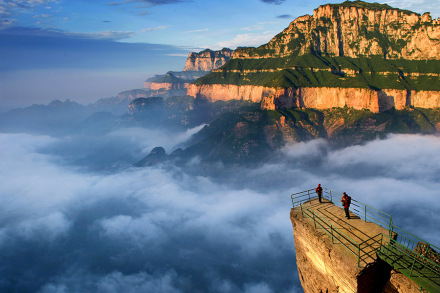 云峰畫廊是一條畫廊式的風光帶,位于老爺頂?shù)陌肷窖,由清峰關(guān)起,環(huán)周8千米,終點又回到清峰關(guān)。它依附老爺頂,連接豫晉關(guān),遙望十字嶺,擷取太行山的精華,依山順勢建造了7個位置極佳的觀景臺,依次為聽禪臺、試膽臺、如畫臺、戲龍臺、丹鳳臺和歸真臺。