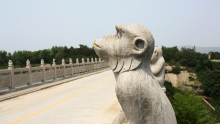 百猴橋,全長107米,壩高15.2米,為16孔15阻攔水壩式景觀橋,護(hù)欄共有石猴130個,故名百猴橋。