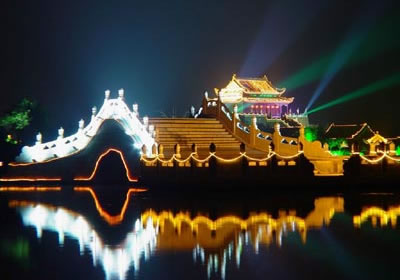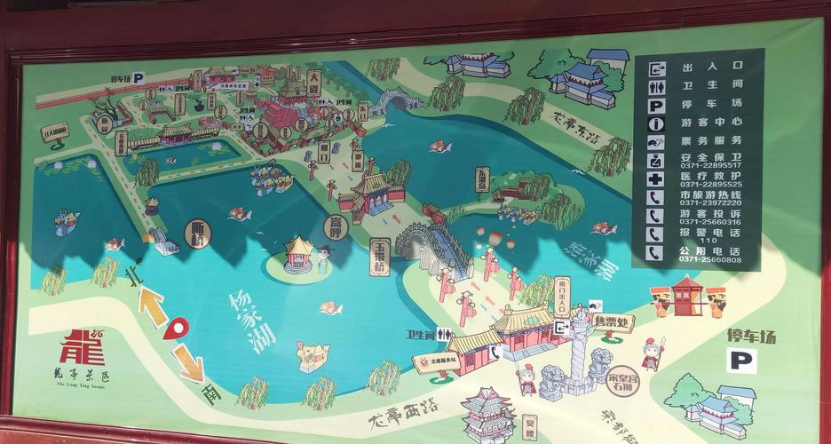 開封是中國六大古都之一,作為北宋王朝的都城達167年之久。當(dāng)時的宋京極為繁盛,宮殿建筑很輝煌?上Ы鹑饲终奸_封時,宋皇宮建筑大部分被燒毀了。后來,又經(jīng)過多次兵燹和黃河決堤,宏偉的宮室已蕩然無存。在過去皇宮遺址上只留下了龍亭公園這座的建筑物,而這座龍亭公園卻是清代所建。龍亭公園坐北朝南,高踞在臺基之上。從地面到大殿有72級臺階。臺階中間是雕有云龍圖案的石階。登上平臺,四周有石欄圍繞。大殿是木結(jié)構(gòu),重檐歇山式建筑,很壯觀。游人登上平臺,入殿觀看陳列的文物后,多在石欄前眺望開封古城景色。龍亭公園前有一條筆直的大道,道旁有兩個東西對峙的湖,東為潘湖,西為楊湖。傳說,東湖為宋朝“太師”潘美的府第,他陷害忠良,是個奸臣,宅院里的湖,水是渾的;西湖為宋朝搞遼名將楊業(yè)的府第,他舍身救國,是個忠臣,宅院里的湖,水是清的。這個說法沒有科學(xué)根據(jù),但反映了人們對忠奸的態(tài)度和感情,F(xiàn)在龍亭公園,潘、楊兩湖,以及龍亭公園后面的假山花園,都辟為龍亭公園公園。從龍亭公園前的大道,過潘、楊兩湖,再往南,仍是一條筆直的大道,兩旁店鋪林立,這條大道歷史上是一條寬闊的御道。