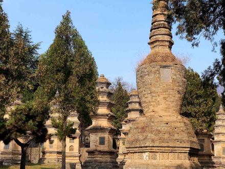 少林寺塔林位于少林寺西300米處,占地面積14000余平方米,是中國現(xiàn)存規(guī)模最大、數(shù)量最多的古塔建筑群,F(xiàn)存有唐、五代、宋、金、元、明、清7個朝代的磚石墓塔241座。因塔累繁多,大小參差、高低不同,粗細不一,形狀各異,排列散亂,看似茂林,故被稱為“塔林”,少林寺塔林集古代磚石建筑、雕刻、書法、繪畫藝術之大成,被專家學者譽為是“古塔藝術博物館”。